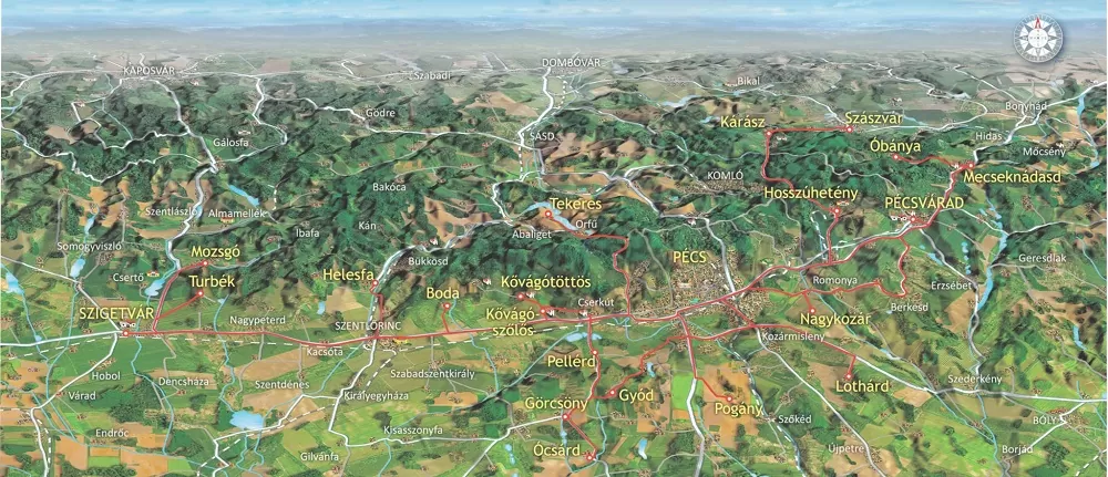 Boda | Görcsöny | Gyód | Helesfa | Hosszúhetény | Kárász | Kővágószőlős Kővágótöttös Lothárd | Mecseknádasd | Mozsgó | Nagykozár | Óbánya | Ócsárd| Pécs | Pécsvárad Pellérd | Pogány | Szászvár | Szigetvár | Tekeres | Turbék